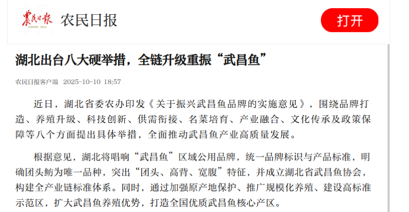 5.武昌鱼品牌作为湖北唯一水产入选农业农村部2025年农业品牌精品培育计划。