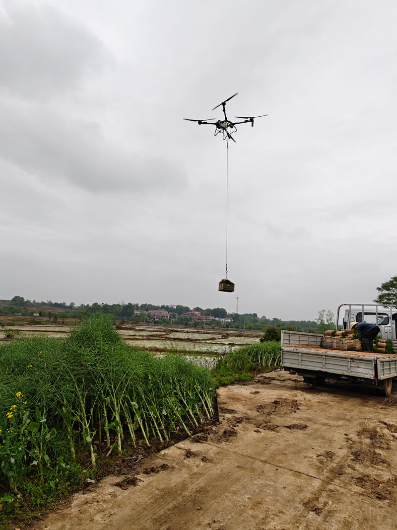 在徐连村早稻种植基地,无人机飞手熟练操作设备,精准吊起秧盘,平稳飞越田间沟渠与地块,高效将秧盘投放至插秧机旁,实现“无人机运秧+插秧机插秧”的协同作业闭环,并针对农户提出的飞行高度、速度等问题耐心解答。