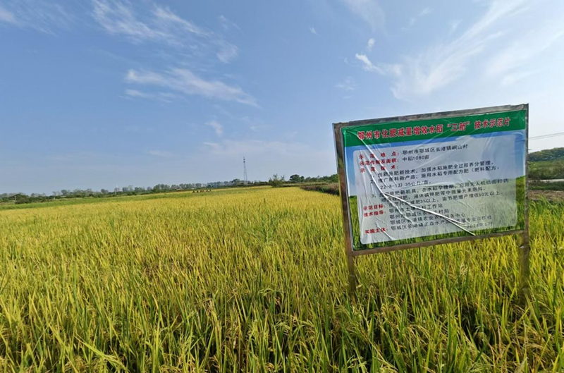 金秋时节,鄂城区泽林镇万亩湖“化肥减量增效三新技术示范区”一片金黄,稻谷飘香。市农业农村局土肥站农技专家介绍说:“在水稻孕穗期,指导农户通过无人机喷施肥中微量元素肥料,可提高水稻的结实率,增加千粒重。通过我们的调查统计,应用“三新”技术的田块,比对比田可亩平节约肥料3%以上,亩产量可以增加30至50公斤,亩平节本增效60元以上”。