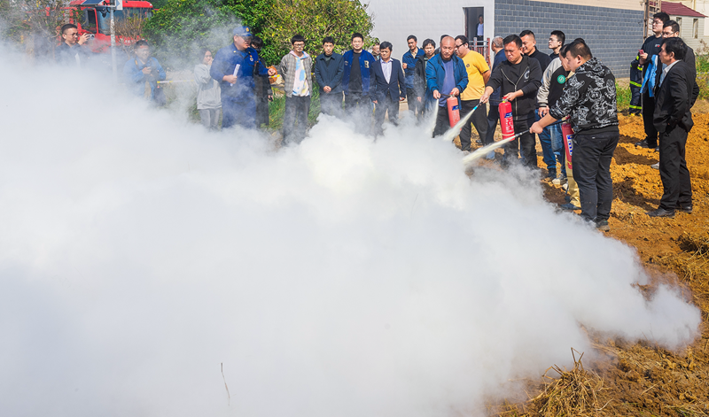 而在另一处,现场正在模拟沼气管道泄漏发生“火情”,浓烟滚滚、烈火冲天。肖绍雄和技工拿上水基灭火器、灭火宝等工具,在消防人员的配合下,迅速扑灭沼气“火情”。工作人员拿着喇叭,根据演练程序同步向大家讲解沼气安全事故正确处置方式和流程。