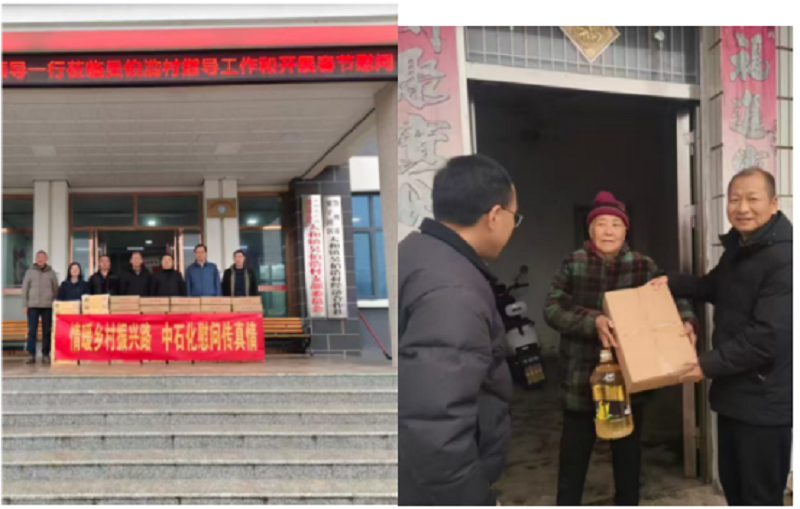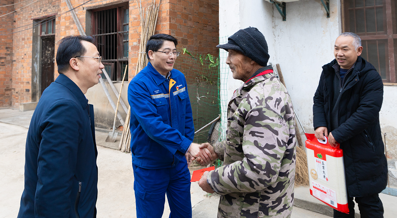 中石化鄂州石油分公司党组书记占峰、纪委书记阳灵芳等一行到梁子湖区太和镇吴伯浩村调研座谈,并为79户脱贫户、10户监测户和7户低保户送去米油等物资及慰问金。